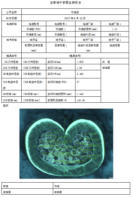 1、端子斷面測(cè)量分析功能:本軟件可測(cè)量端子芯線數(shù);壓接高度;壓接寬度;壓接角度;支承高度;尖端間距;毛刺高度;毛刺寬度;基體厚度;芯線斷面積;斷面積壓縮比率。